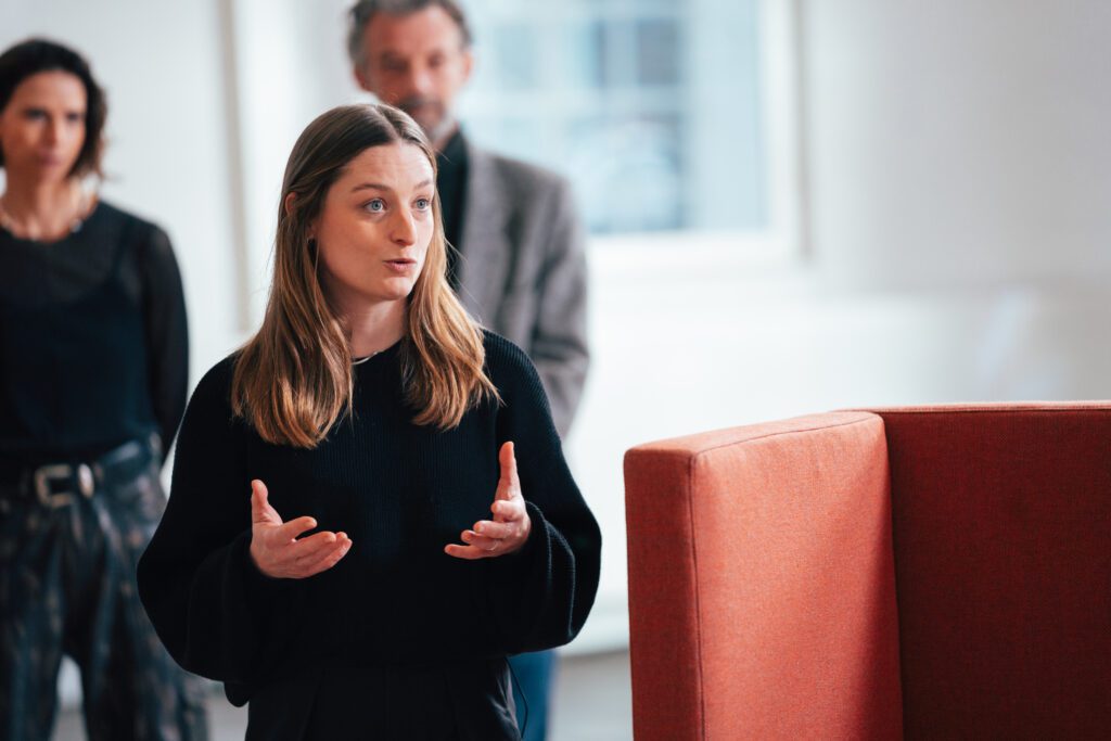 Designeren Saskia Hübner sikrede sig sejren i DR-programmet Danmarks næste klassiker med sin røde kontorsofa lavet af 100 pct. genanvendte tæppeplader fra tæppegiganten Ege Carpets.